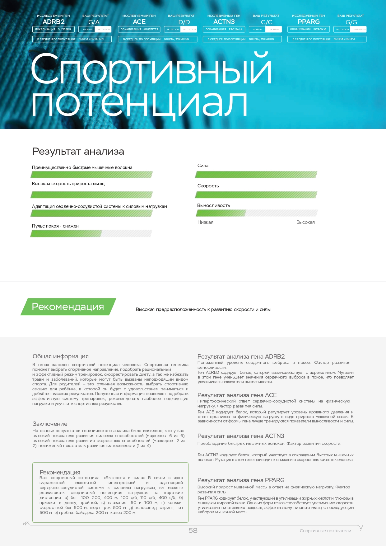 Этот генетический анализ показывает, к каким видам спорта и физическим нагрузкам ребенок предрасположен генетически. Можно заниматься любыми видами спорта, но в определенных видах ребенок достигнет высоких результатов быстрее других детей и с меньшими усилиями. Поэтому мы рекомендуем пройти наш ДНК-тест спорт для ребенка в Нижних Сергах.